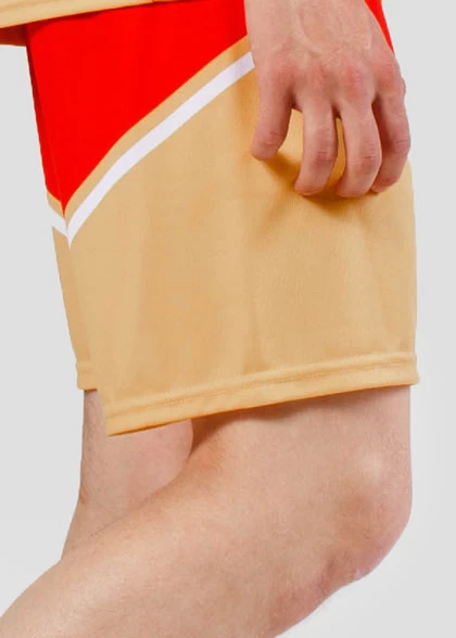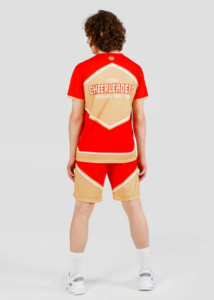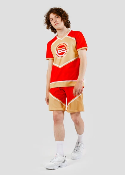 EscaperОписание: Комплект мужской для чирлидинга. Футболка свободного кроя с V-образной горловиной из рибаны. Втачной рукав с манжетой из рибаны. Цельнокроеные шорты средней длины свободного силуэта. Эластичный пояс с внутренним шнурком для регулировки. Полная сублимация — любой цвет и дизайн (уже входит в стоимость).